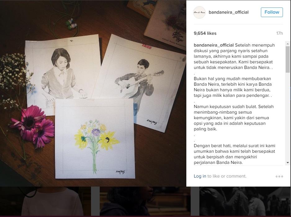 Jika sobat merupakan pengguna Twitter, maka salah satu trending topic hari ini adalah tentang band Banda Neira. Kenapa jadi heboh? karena pada hari ini band menyatakan secara resmi bubarnya mereka yang ditulis melalui akun instagram.com/bandaneira_official