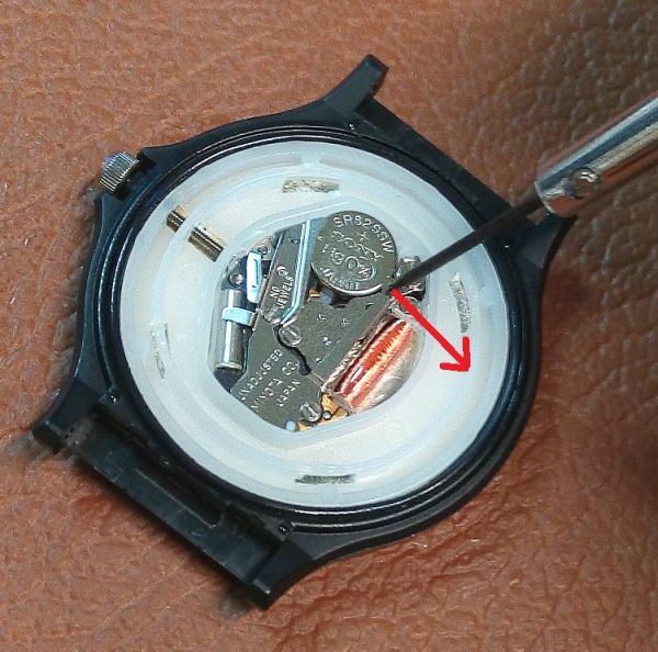 Setelah tutup belakang terbuka, ganti batre arloji dengan cara mencongkel / menggeser pengunci baterai seperti gambar dibawah. Hati-hati jangan sampai obeng mengenai kumparan atau benda yang berbentuk tabung karena hal tersebut bisa merusak mesin jam.