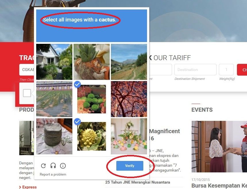 Pada contoh diatas, ditulis: "Select all images with a cactus" Itu artinya kita disuruh untuk mencari semua foto yang ada gambar kaktusnya. Sobat tinggal klik satu atau beberapa gambar yang menampilkan kaktus > setelah itu klik Verify > klik tracking lagi.