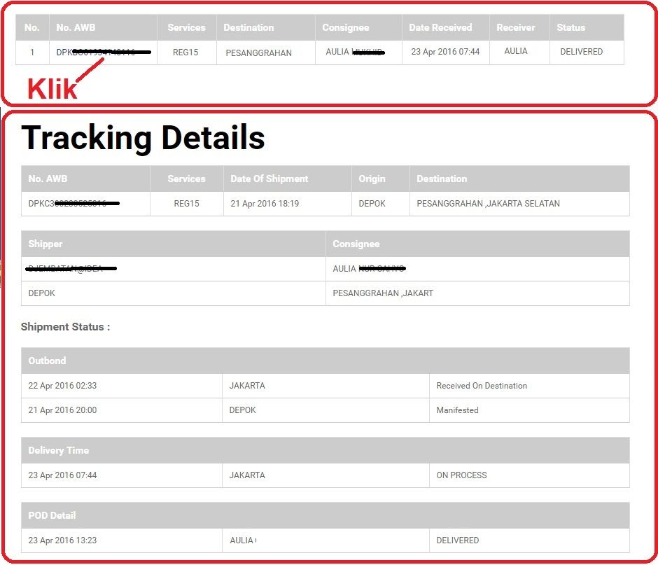 Sebagai catatan, untuk dapat melihat lebih detil status kiriman bisa dengan cara mengklik pada nomor resinya di website JNE. Dibawah ini adalah contoh gambar status pengiriman: